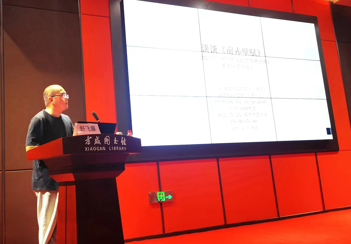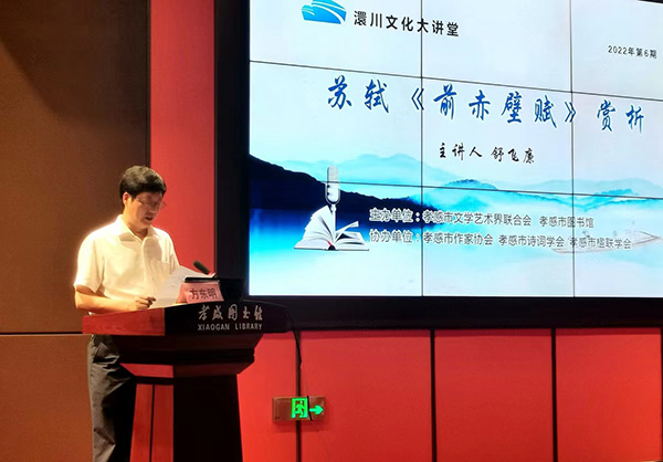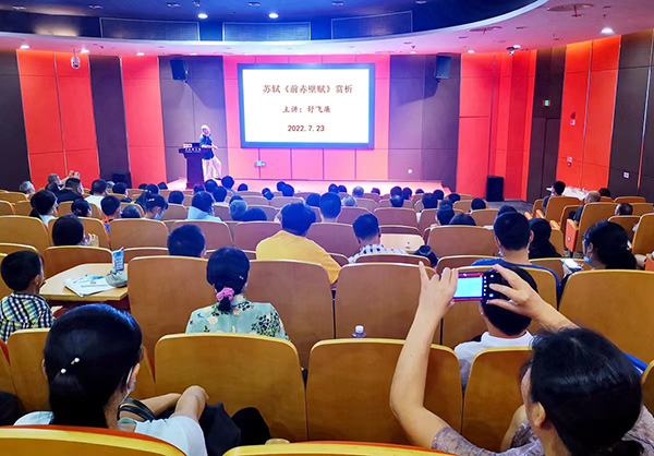 7月23日,知名作家舒飞廉应邀回家乡孝感市在文化中心图书馆报告厅开展文学讲座。他旁征博引地讲授的题为《苏轼<前赤壁赋>赏析》,受到在场文学爱好者和苏轼文学粉丝的热烈欢迎和一致好评。