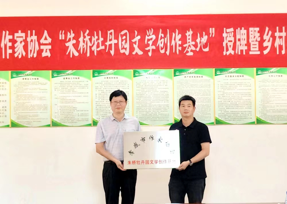随后,孝感市作家协会主席方东明、孝感市作家协会副主席兼秘书长朱道能,与湖北长生堂高新农业有限责任公司总经理郑绍伟进行了“朱桥牡丹园文学创作基地”授牌及合作协议签约仪式。