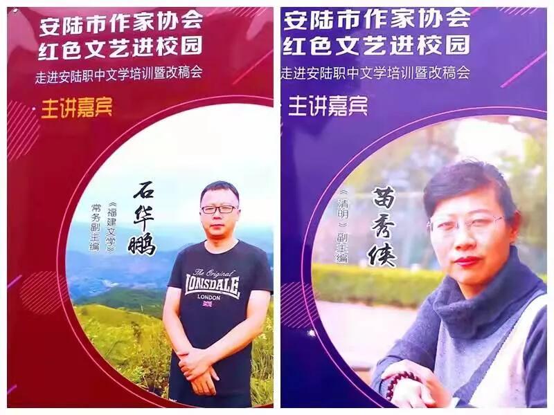 上午,在安陆中等职业技术学校报告厅,石华鹏和苗秀侠两位老师围绕文学创作分别做了精彩的讲授。孝感市作协副主席、安陆市作协主席喻长亮主持活动,湖北省作协副主席、著名作家曹军庆在讲座开始前进行了激情的文学演讲。其间,石华鹏、苗秀侠老师分别就“阅读”“语言”“选材”等话题与大家进行了现场互动交流。安陆文学作者和安陆中职的文学爱好者百余人聆听了讲座。