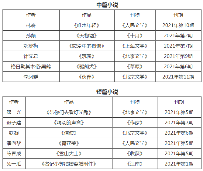 虎年春节前,“2021年中国当代文学最新作品排行榜”在北京揭晓。林森的中篇小说《唯水年轻》,邓一光的短篇小说《带你们去看灯光秀》,周晓枫的散文《幻兽之吻》,铁流的报告文学《靠山》等24部作品分别入选中篇小说榜、短篇小说榜、散文随笔榜和报告文学榜4个榜单。
