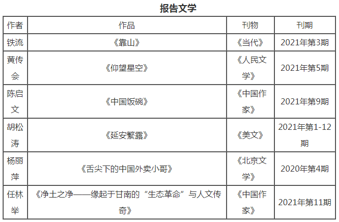 由《北京文学》主办的中国当代文学最新作品排行榜创办于1997年,是国内最早、时间最长的文学作品排行榜,也是迄今国内门类最齐全的综合性文学排行榜之一,至今已经举办了25年。在客观、公正、多元的原则指导下,经过多家文学选刊和全国多位专家学者推荐,在近两个月的专家与编辑审读讨论的基础上,遴选出一批兼具文学性、思想性和时代特色的原创年度文学佳作。本届排行榜入选篇目略有调整,由往届的每年每个门类5篇作品增至6篇作品。 入选的6部中篇小说各有特色,或探寻形而上命题,或呈现原生态体验,或切入潜意识场域,或揭示现实问题,在情感、哲思、审美层面皆有深刻的启示。林森的《唯水年轻》叙写几代渔民的生死守候,呈示风云变幻下不变的精神传承,结构运筹从容有度,叙事调度游刃有余。《天物墟》是孙频近年来系列作品中的集大成者,对收藏的境界、姓氏的尊严、人生的归宿,皆有探寻,是兼具深度意识和细节感的好作品。计文君的《筑园》以凝练的语言和繁复的线索,阐释了一个梦想驱动下的浩大世界,提醒人们在新的疫情时代重新寻找共识。姚鄂梅的《恋爱中的树懒》聚焦人内心的暗黑处,一个失败母亲的一生从充满悬念的氛围中清晰起来,无解的悲剧令阅读者重新反思亲子关系。格日勒其木格·黑鹤的《驱熊犬》是一篇动物小说。驱熊犬勇猛忠诚,有着异于人类的纯粹和无畏;作者的叙述自然、灵性、阳刚,传达出可贵的原生态体验。李凤群的《伙伴》将不同时代两个少年的成长进行对照,反思教育体制中存在的问题,悲愤压抑的主体情绪为小说撑起了从宣泄、呐喊到批判的意义场。 上榜的6部短篇小说,从不同侧面展现了中国的城市与乡村、历史与现实以及时代变迁中人的命运。《带你们去看灯光秀》是邓一光继去年的上榜短篇之后再度上榜的佳作。题为灯光秀,实是中年夫妻的情感秀,表层波平浪静,深层却暗流汹涌,波澜起伏,是一个时代的众生相。迟子建的《喝汤的声音》以一个幻影般的女人在小酒馆里讲述哈喇泊家族三代人在黑龙江边的生活经历,独有的笔调写出了战争的创伤、生命的轮回和命运的背面。铁凝的《信使》是年度短篇小说的宝贵收获,饱满舒缓,纯粹丰饶,温柔苍劲,以表层意义上的“信使”故事探究了形而上层面的“信使”意涵。潘向黎的《荷花姜》写到的“死亡”和爱情的幻灭相关,婉转精幽的笔锋直指婚姻无处逃离、情感无力交流的现代城市精神困境。陈春成是唯一入选的90后作家,他的《雪山大士》初步彰显了新锐作家的创作实力。一个明星偶像去光环化的故事,写出了芸芸众生令人惊叹的传奇体验,文字的老到显示出难得的经典品质。须一瓜的《名记小郭结婚离婚附件》是一次愚人节愚人报道引发的故事,虚构事件带来生活变故和另一种人生走向。语言如何影响存在,虚构怎样改变现实,这篇小说用独特的方式给出了答案。 本年度入选散文汇聚了中国当下最优秀的一批作家,他们的作品继续拓展着散文的丰富性与可能性。周晓枫的《幻兽之吻》用辨识度极高的笔调,写下小兽们在她生活与灵魂里刻下的痕迹。李敬泽的《天与春秋》中王朝的更替、秩序的颠覆,让我们从另一个侧面看到中国文化丰富和宽阔的部分。陈福民的《遥想右北平》是当代学者与历史的深层对话,不妨视为作者对家乡的致敬礼赞。《梁庄十年》是梁鸿作品更具文学性的一篇,用全新视角审视了中国村庄的变迁,将梁庄的人们再次带回我们的视野。汗漫《将来之花园》以现代诗人徐玉诺的人生轨迹,为波澜壮阔的中国近现代史提供了一个生动侧面。陈年喜的《活着就是冲天一喊》记录中国底层劳动者的真实命运,粗粝、沉重,别有一种深沉的温柔与细腻。 2021年是中国共产党建党百年,回顾百年历史,抒写光辉足迹,成为报告文学的突出主题。铁流的《靠山》,大规模书写人民群众踊跃支前,描绘了大量平凡又伟大的百姓形象,印证了人民和党之间互为靠山的关系。黄传会的《仰望星空》聚焦我国航天事业,全景展现“共和国勋章”获得者孙家栋院士及一批航天人的人生轨迹和重大贡献。陈启文的《中国饭碗》则将眼光投向中国的粮食安全,用大量事实和细节揭示了中国由“吃不饱”到“吃得饱”并且“吃得好”的历史性转变。胡松涛的《延安繁露》在《美文》杂志连载12期,写党的“七大”前后的事与人,围绕党史,别开生面,严谨中趣味横生。杨丽萍的《舌尖下的中国外卖小哥》以纪录片式的笔触呈现了城市外卖小哥群体的生活状态。任林举的《净土之净——缘起于甘南的“生态革命”与人文传奇》以隽永的文字全面呈现了甘南的“环境革命”,挖掘出蕴藏于甘南人民心中的环保意识。6部上榜报告文学心系时代,胸怀天下,厚重沉稳,精彩纷呈,显示了报告文学聚焦时代的大视野和捕捉大历史的能力。 2021年中国当代文学最新作品排行榜入选篇目