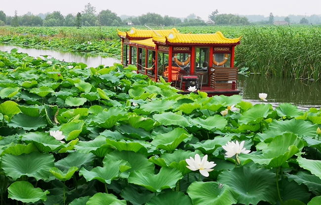 饭后,我们荡舟湖上,九渠十八汊,荷叶田田,芦苇轻扶。眼前的一切都让人觉得不太真实。难道这就是万主任所说的曾经消失的湖?这一刻,我明白了朱湖的美究竟美在哪里。朱湖之美,并不是单一的存在,它是层层递进的。一串串波光粼粼的明珠连成一片大湖,树林、小岛屿间插其中,自成一体又连成一片。明明各自分离,却又紧紧相依。 这里的水幽深,墨绿,滋养着一片片荷花、芦苇、菖蒲,他们是任性的孩子,逢水抽条,遇风便壮,恣意生长。这一湖的水生植物,不需要人种,也不需要人管,只待季节提醒,它们便绽放出最美的姿态,把朱湖装扮得楚楚可人。