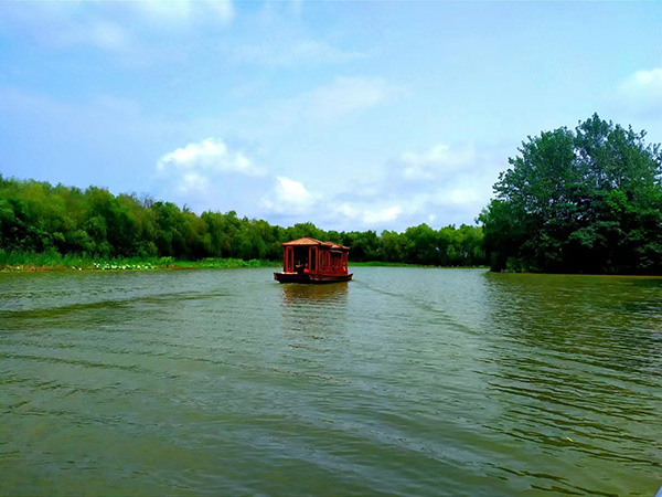 在万主任教科书般的介绍中,我们在湖岸码头登上了一条游船,宽大的船体,舒适的座位,朱红的落船窗,古色古香,应该是湖中比较好的游船了。我开玩笑地对同行的孝感作协方主席说,要是敞篷游船就好了,更易饱览湖光山色,也有野趣。方主席戏谑地说,两人的划子更有味。众人听了我们的对话,都会心一笑。正在我们坐在船上时,有艘黄色顶篷的小船已经在我们的前面开走。那艘船,没有船栏,像一处漂浮在水面上的凉亭,人坐在其中,手一伸就可以接触到湖水。其实,我更喜欢这样的船。看着在波光粼粼的湖面上远去的船影,我们对这次朱湖泛舟就充满了期待。我们的游船是条电瓶船,发动后,并没有“突突”的马达轰鸣声,更没有刺鼻的柴油味,一切都是那么环保。