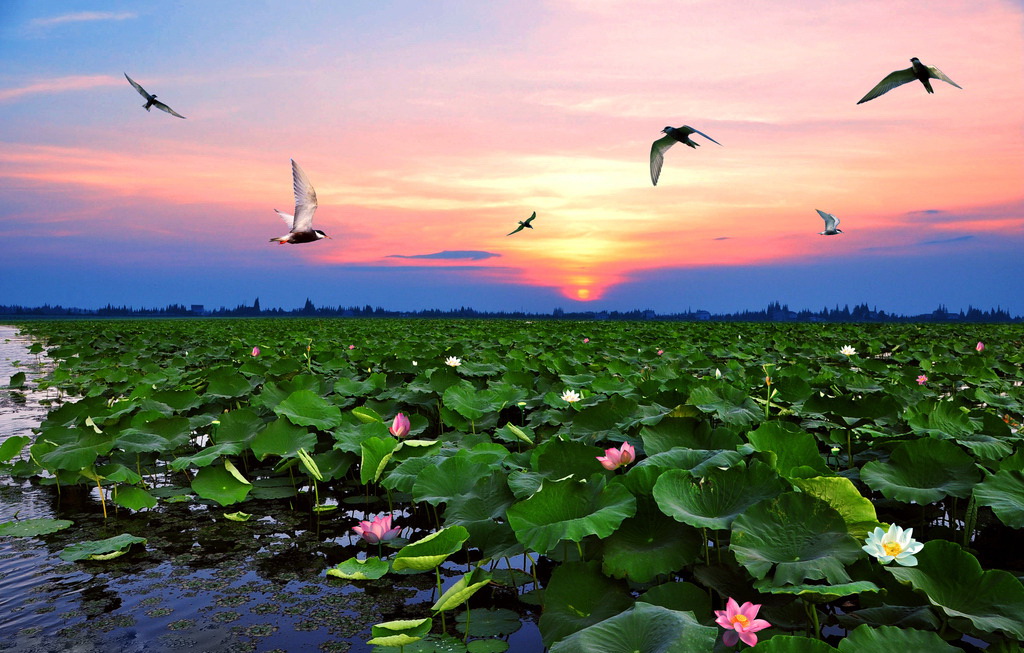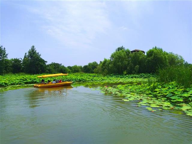 在这些像河道的湖上泛舟,最大的惊喜是,能和湖里的植物来一个亲密的接触。湖里,荷最多,这里一片,那里一坨,在哪里都是葱葱绿绿。船在经过一大片荷塘(姑且称塘)时,几乎是擦着荷叶在走。此时,不要刻意去想,就能记起朱自清先生的《荷塘月色》来,“叶子高出水面,像亭亭的舞女的裙。”也正巧,网络上正在为这篇课文打口水仗。有的说,要将此文逐出课文,原由盖是将荷叶比拟成舞女的裙,有误导少男少女之嫌。有的说,朱写此文是患了女性幻想饥渴症,而且是民国很多男人的通病,实在不雅。突然,一阵风,吹动着荷叶,将荷叶翻了过个,我“扑哧”一笑,如果将荷叶比作舞女的裙,此时,那确实不雅,确实会误导少男少女们。方主席不知为何而笑,还以为是看到荷花已然开放而高兴呢。荷花是开了,但还不能说是盛开。你看,有花苞紧闭的,像菩萨合着双手,一脸的慈祥;有半开的,犹如半抱琵琶半遮面;有全开的,花瓣打开,像张开的手掌,欢迎着世界。而这些荷花,红莲居多,像团团红霞隐藏或高于荷叶之间。“母亲啊,你是荷叶,我是红莲,心中的雨点来了,除了你,谁是我在无遮拦天空下的荫蔽?”早年读过的冰心的句子自然而然涌来;也有不少白莲,洁白的花朵,高出荷叶,像蒙着一层素洁的轻纱,缭绕在绿色的荷叶之上,别有一份妖娆。早开的花朵里,已经有莲蓬卧在花蕊中,像襁褓里宁馨儿睡在年轻的母亲的怀抱,恬静而安祥。看着如盖的田田的荷叶,我伸出手,想去摘一枝,可手却没够着,扑了一空。船老大,仿佛看透了我的心,也可能是在经年的驾船经验中,参透了人心,竟把船直接地往荷叶中开。用欧阳诗人的话说,不像一次误入,而是蓄谋已久。我惊嚷道,别,别把荷叶折断了。可船头已经闯进了荷叶阵,“劈劈啪啪”,荷叶一片倒伏。我很容易地顺手折了一枝荷叶,戴在头上。调皮的丁芳见状,急忙掀起我头上的荷叶,并唱起“掀起你的盖头来。”女作家们见到已开的荷花,闻香而动,哪里在船舱里坐得住?纷纷钻出了船舱,爬到了船头。我和方主席只得让位给她们,退进了船舱。五朵金花们,或手执着荷花,像捧着一朵宝玉;或作着嗅花状,像蜜蜂采着荷花蜜;或双手举着荷花,像擎着火红的信念......连船老大都怜花惜玉,走到船头,帮着去修正背景荷花的姿态。男士们,此刻人人都是摄影师,“拍拍拍”,一张张笑靥如荷花的照片定格在朱湖。