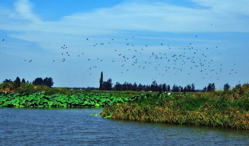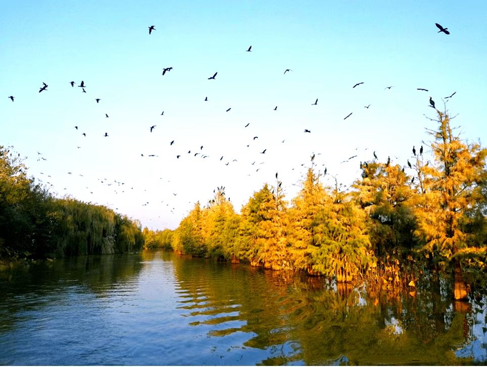每年十月以后,朱湖的任何一棵树,都可见到鸬鹚、白鹭、灰喜鹊歇在树梢,怡然自得。朱湖的天空,有成群结队的鸟群掠过,遮天蔽日是夸张,但密密麻麻,却是事实。一时,鸟叫,雁鸣,鹅唤,像是在朱湖合唱又是独吟,像是长啸又是高吭,像是交响乐又是音乐会,真是一种恢宏的场面,令人流连。而且,湖上的池杉红了,可看绿湖映杉红;柳叶落尽,可赏枯柳如丝拂湖面;荷花凋零,可怜残荷伫湖听雨声,那又是另一种风韵诗意。万主任如诗如画地说着的时候,游船前面,不时有白鹭群在飞翔,在追逐,在颉颃,还发出欢叫声。