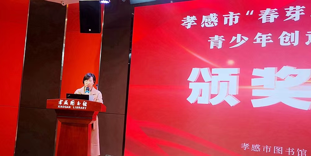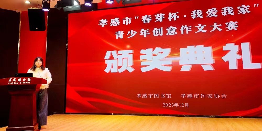市图书馆馆长刘艺女士首先致辞,对与会老师、同学们表示热烈的欢迎,对大家长期以来对图书馆阅读推广工作的关心与支持表示衷心的感谢!在介绍本次大赛情况时,她说,以“我爱我家”为主题,以点及面,以小见大,抒写青少年学生在成长过程中所感受到的家庭之爱和孝感之美,在50篇获奖作品中,情真意切地表达了家庭中的血脉亲情和孝感大家庭建市三十周年的重大成就,同时彰显了孝感浓厚的书香氛围和孝文化底蕴。最后,她祝愿获奖的同学们再接再厉,不断提高自己的文学素养,为家庭、为家乡、为祖国的繁荣昌盛贡献自己的一份力量。她同时希望全体同学都能从这次比赛中汲取营养,激发自己的创作热情,用文字记录生活,用心灵感悟世界,并欢迎同学们今后多走进图书馆,把图书馆当作第二课堂,积极参与、宣传图书馆的阅读推广活动,一起厚植文化土壤,建设更美好的家园。