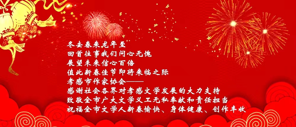 辞旧迎新气象新,征程万里风正劲。在新的一年里,孝感作协将继续砥砺前行,坚定不移地用习近平新时代中国特色社会主义思想凝心铸魂,继续以打造品牌协会为目标,以创新发展为动力,以服务创作为己任,围绕市委市政府的中心主题开展文学活动,围绕新时代山乡巨变创作主题抒写时代发展,围绕孝感重大主题开展文学作品征文大赛,围绕“文学进校园”加强青少年文学人才发现和培养,围绕服务创作进行作品研讨和文学辅导,为推动孝感高质量发展,打造武汉都市圈重要节点城市贡献文学力量!