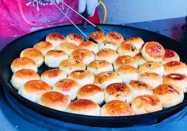而煎包子的过程,则是一门艺术。火候的掌握至关重要,既不能过旺,也不能太弱。老人儿们总爱开玩笑,说负责加柴的必须得是个“嘹亮人”,嘴巴可以聊不停,心神可不能挪半寸。只有恰到好处的火候,才能煎出那黄亮焦香的水汽包子。包子要黄亮,菜油是秘诀。如斗大的平底锅,刷一层菜油,摆上几十个白胖中透着绿意的包子,再淋一道清水加面粉调成的极清的面糊,就可以加盖开煎了!最多10分钟,就得掀锅盖了。不过别急,掀了锅盖还得往各个包子的间空隙处再淋一道菜油,再煎。接下来就是见证师傅手艺的时候了。眼见着包子间的空隙处煎出金黄色,就得赶紧给包子翻面了。几十个包子一个个翻完,要快,要准!就着这翻面的时间,包子的反面也就煎够了。翻完了,漂亮的水汽包子也就可以出锅了。