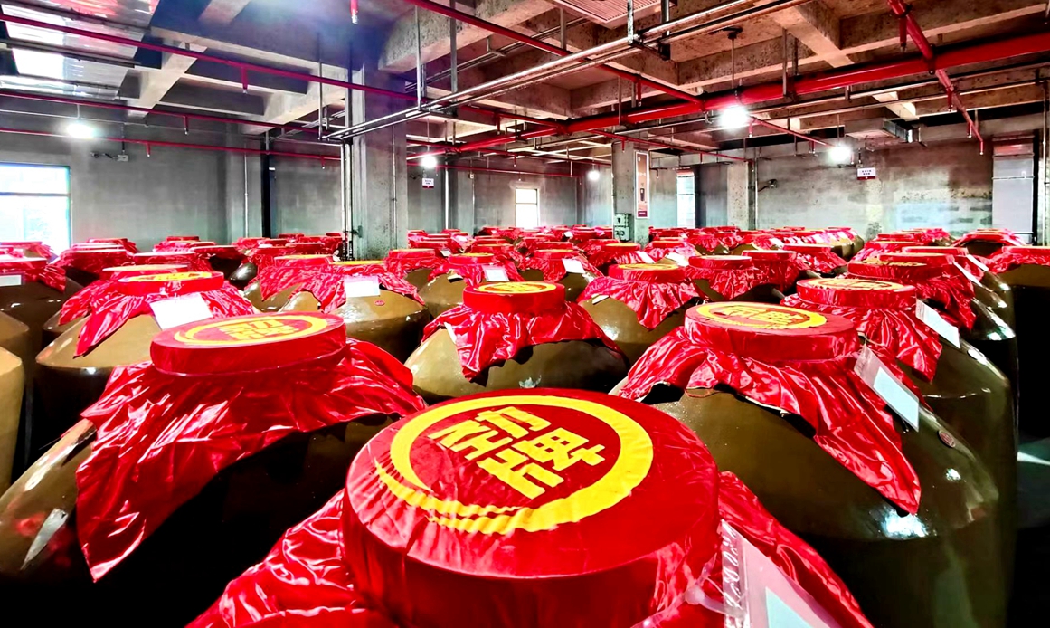 次日上午,作家们来到了“在水一方”陶坛酒库。推开厚重的门扉,一排排陶坛如山峦般静默矗立,每一只坛中都封印着流动的时光。讲解员解释道,陶坛壁上的微孔使酒液与外界空气缓慢交互,正是在这种“呼吸”中,新酒的烈性逐渐褪去,变得醇和柔顺。一行人穿行于坛间巷道,如同漫步在时间的长廊,品味着“岁月予人以皱纹,予酒以灵魂”的酿造哲学。