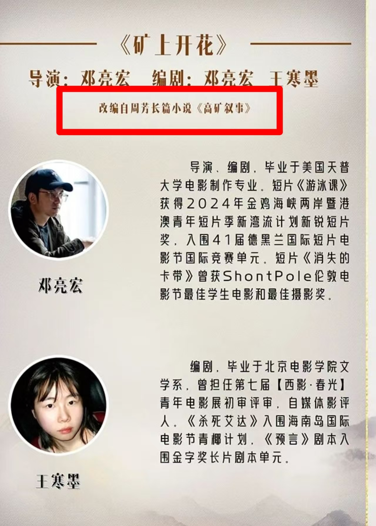 (本网讯)近日,猎鹰计划短片创作季“我心中的那座城——千里荆楚地”在北京圆满举行了30强项目终审路演。经过艺术导师团的专业评审,并结合湖北五城的综合意见,最终遴选出年度五强项目和两部竞争项目。其中,改编自孝感作家周芳长篇小说《膏矿叙事》的电影项目《矿上开花》成功入选年度五强,备受关注。