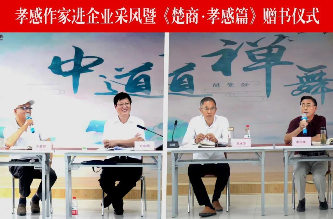 (本网讯)9月6日下午,由孝感市作家协会和湖北省宏阳新型建材股份有限公司(以下简称宏阳公司)联合主办的“孝感作家进企业采风及《楚商·孝感篇》赠书仪式”在孝感宏阳公司举行,市作协名誉主席、顾问、主席团成员及部分作家,宏阳公司领导及中层管理干部和特邀嘉宾等20余人一同参加活动。 宏阳公司总经理王水华对各位作家及嘉宾的到来表示热烈欢迎!同时从人生奋斗的感悟、当下企业运行情况以及对世界的看法进行了精彩的分享。他在谈人生感悟中分享了自己筑梦楚天的励志创业路;在介绍公司情况时分享了宏阳人“创造创新,让奋斗者有机会、得实惠”的文化理念;同时分享了自己多年来的读书体会和王东岳哲学思想,与会者深感受益匪浅。